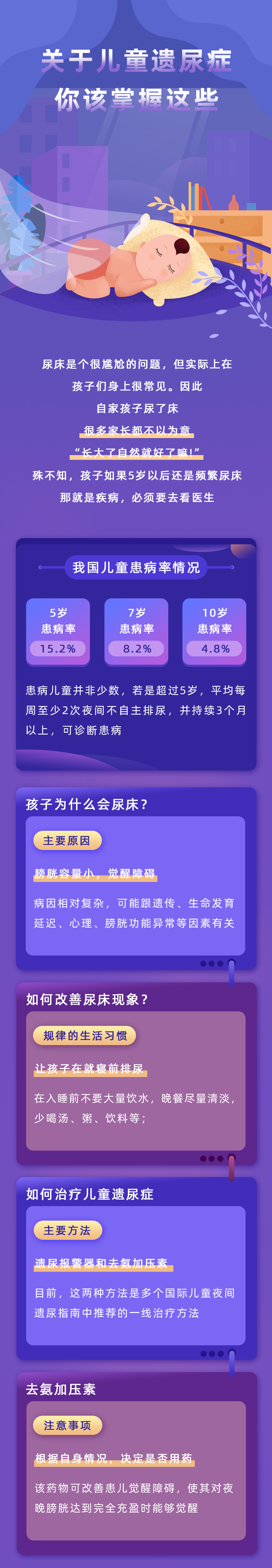 据《2017中国儿童和青少年遗尿症流行病学调查报告》显示,约有16%的5岁儿童、10%的7岁儿童和5%的11~12岁儿童患有夜遗尿。