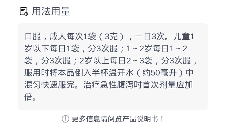 1.治疗急性腹泻时,应注意纠正脱水。 2.如出现便秘,可减少剂量继续服用。 3.需同服肠道杀菌药时,请咨询医师。 4.儿童用量请咨询医师或药师。 5.儿童急性腹泻服用本品1天后、慢性腹泻服用2-3天后症状未改善,请咨询医师或药师。 6.如服用过量或出现严重不良反应,应立即就医。 7.对本品过敏者禁用,过敏体质者慎用。 8.本品性状发生改变时禁止使用。 9.请将本品放在儿童不能接触的地方。 10.儿童必须在成人监护下使用。 11.如正在使用其他药品,使用本品前请咨询医师或药师。