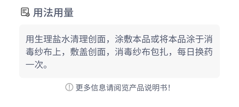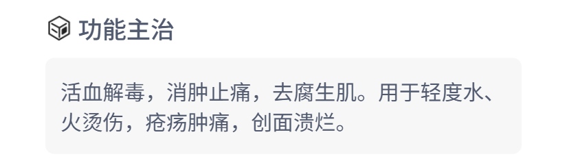 用于轻度水、火烫伤,疮疡肿痛,创面溃烂。