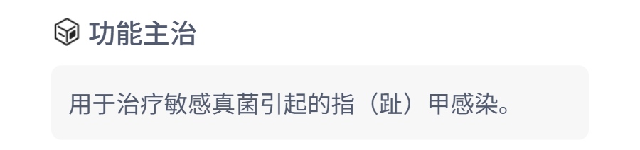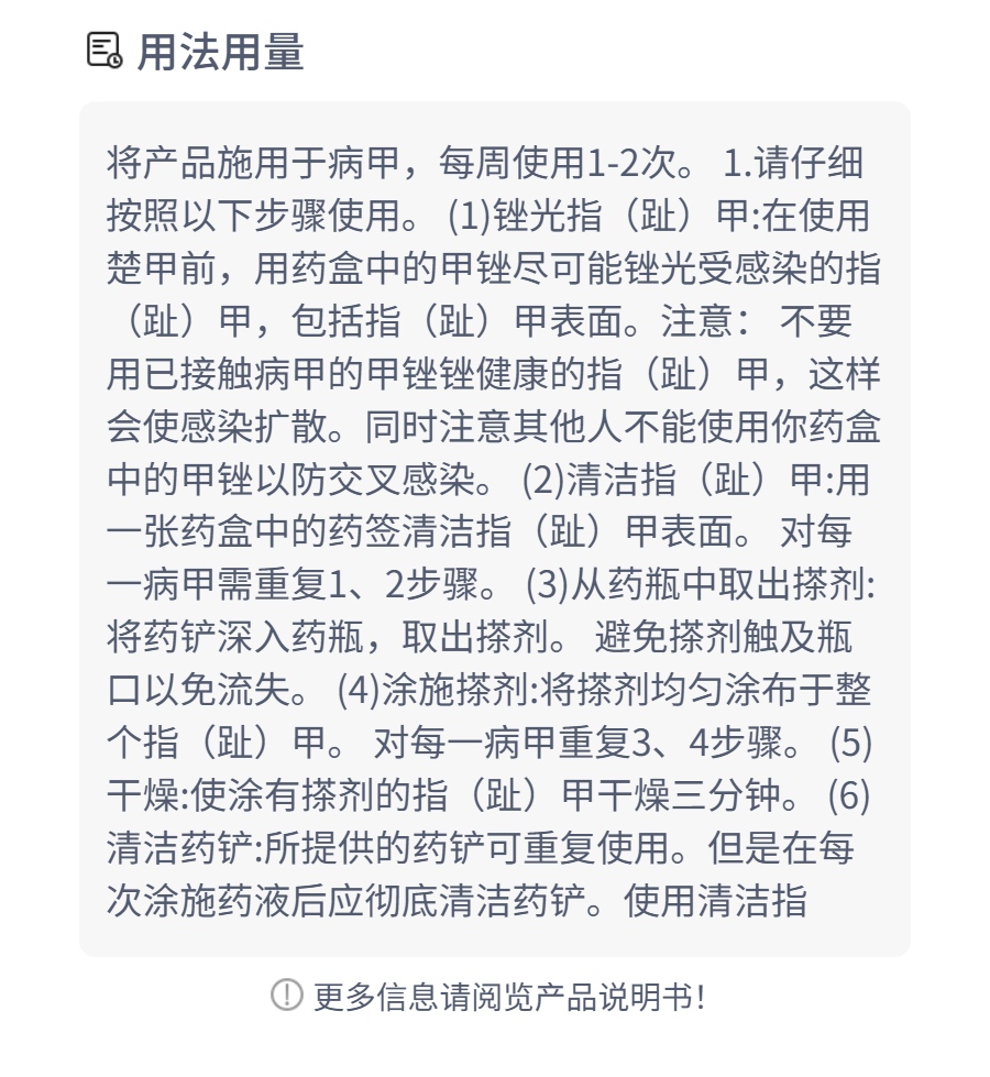 2.甲真菌感染面积较大的患者,如多余2个指(趾)甲、单(趾)感染面积超过指甲面积二分之一的患者需要综合治疗,使用本品前应咨询专科医生。