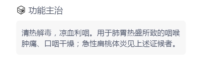 1.忌烟酒、辛辣、鱼腥食物。 2.不宜在服药期间同时服用滋补性中药。 3.糖尿病患者及有高血压、心脏病、肝病、肾病等慢性病严重者应在医师指导下服用。 4.儿童、孕妇、哺乳期妇女、年老体弱、脾虚便溏者应在医师指导下服用。 5.扁桃体有化脓或发热体温超过38.5℃的患者应去医院就诊。 6.服药3天症状无缓解,应去医院就诊。 7.对本品过敏者禁用,过敏体质者慎用。 8.本品性状发生改变时禁止使用。 9.儿童必须在成人监护下使用。 10.请将本品放在儿童不能接触的地方。 11.如正在使用其他药品,使用本品前请咨询医师或药师。
