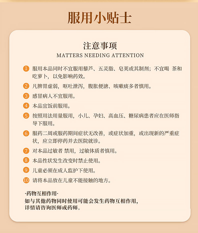 1.服用本品同时不宜服用藜芦、五灵脂、皂荚或其制剂;不宜喝茶和吃萝卜,以免影响药效。 2.凡脾胃虚弱,呕吐泄泻,腹胀便溏、咳嗽痰多者慎用。 3.感冒病人不宜服用。 4.本品宜饭前服用。 5.按照用法用量服用,小儿、孕妇、高血压、糖尿病患者应在医师指导下服用。 6.服药二周或服药期间症状无改善,或症状加重,或出现新的严重症状,应立即停药并去医院就诊。 7.对本品过敏者禁用,过敏体质者慎用。 8.本品性状发生改变时禁止使用。 9.儿童必须在成人监护下使用。 10.请将本品放在儿童不能接触的地方。 11.如正在使用其他药品,使用本品前请咨询医师或药师。