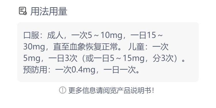 1.静脉注射较易致不良反应,故不宜采用;肌内注射时,不宜与维生素B1、维生素B2、维生素C同管注射。 2.口服大剂量叶酸,可以影响微量元素锌的吸收。 3.诊断明确后再用药。若为试验性治疗,应用生理量(一日0.5mg)口服。 4.营养性巨幼红细胞性贫血常合并缺铁,应同时补充铁,并补充蛋白质及其他B族维生素。 5.恶性贫血及疑有维生素B12缺乏的病人,不单独用叶酸,因这样会加重维生素B12的负担和神经系统症状。 6.一般不用维持治疗,除非是吸收不良的病人。