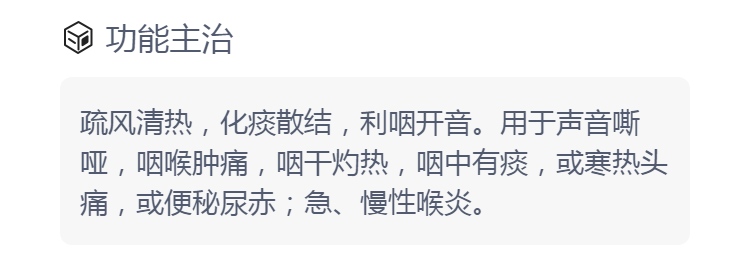 用于声音嘶哑,咽喉肿痛,咽干灼热等