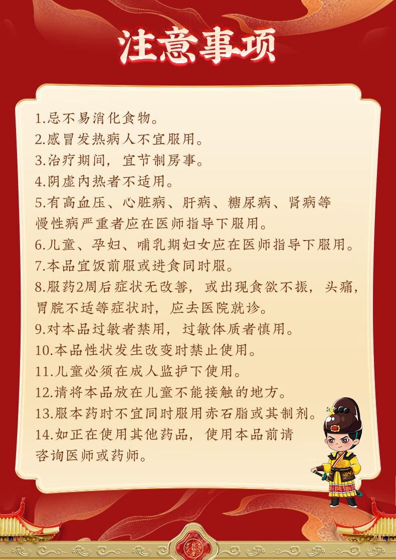 1.忌不易消化食物。 2.感冒发热病人不宜服用。 3.治疗期间,宜节制房事。 4.阴虚内热者不适用。 5.有高血压、心脏病、肝病、糖尿病、肾病等慢性病严重者应在医师指导下服用。 6.儿童、孕妇、哺乳期妇女应在医师指导下服用。 7.本品宜饭前服或进食同时服。 8.服药2周后症状无改善,或出现食欲不振,头痛,胃脘不适等症状时,应去医院就诊。 9.对本品过敏者禁用,过敏体质者慎用。 10.本品性状发生改变时禁止使用。 11.儿童必须在成人监护下使用。 12.请将本品放在儿童不能接触的地方。 13.服本药时不宜同时服用赤石脂或其制剂。 14.如正在使用其他药品,使用本品前请咨询医师或药师。