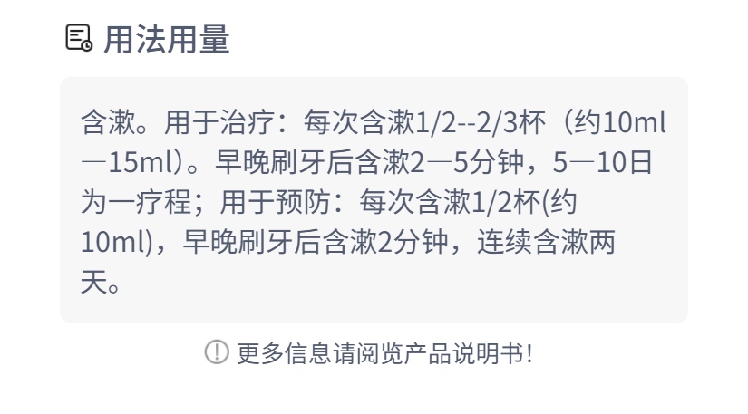 1、本品连续使用不宜超过3个疗程。 2、含漱时至少在口腔内停留2-5分钟。 3、本品仅供含漱用,含漱后吐出,不得咽下。 4、用时应避免接触眼睛。 5、对本品过敏者禁用,过敏体质者慎用。 6、本品性状发生改变时禁止使用。 7、请将本品放在儿童不能接触的地方。 8、儿童必须在成人监护下使用。 9、如正在使用其他药品,使用本品前请咨询医师或药师。