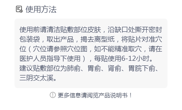 1.使用前清洁贴敷部位。 2.请勿贴敷在皮肤过敏处。 3.若皮肤有不适感,请立即停止使用。 4.本品为外用一次性产品,请勿反复使用。 5.对磁场敏感者如产生头晕、呕吐等晕磁现象,应立即停用。 6.本品不能代替药物。