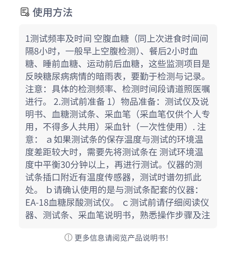 1.本产品只用于体外监测,测试结果不能作为糖尿病诊断的依据。 2.本产品只能与EA-18血糖尿酸测试仪配合使用,请勿与其他公司产品或本公司其他型号混用。 3.采血笔只能供专人使用,请勿多人共用。测试条、采血针只能一次性使用,请勿重复使用. 4,请在要求的条件下进行测试,否则可能影响测试结果。 5.请按照标准的操作程序进行测试。如不按照标准的操作程序进行检测,可能产生错误的结果 6,如果自觉症状与血糖测量结果不符,并已确定按照说明书进行操作,请与医护人员联系,切勿忽略身体症状,仅根据测试结果对血糖控制方案进行重大改变。 7,请将本血糖监测系统与医院生化血糖检测结果进行定期的比较,以确定血糖监测系统处于正常工作 8本产品不适用于新生儿血糖的检测. 9,使用后的采血针,测试条按医用废弃物进行处理。 10请勿储存于温度及湿度过高的场所:请勿让阳光长时间直接照射测试条。 11.请勿折叠或重物压测试条:测试条存放不当,可能对检验结果产生影响 12.取出的试条应立即使用,瓶装测试条开瓶后应将瓶盖盖严,储存条件与未开封的瓶装测试条相同。 13.请将测试条保存在儿童不能接触到的地方。