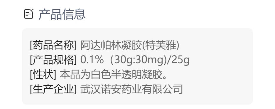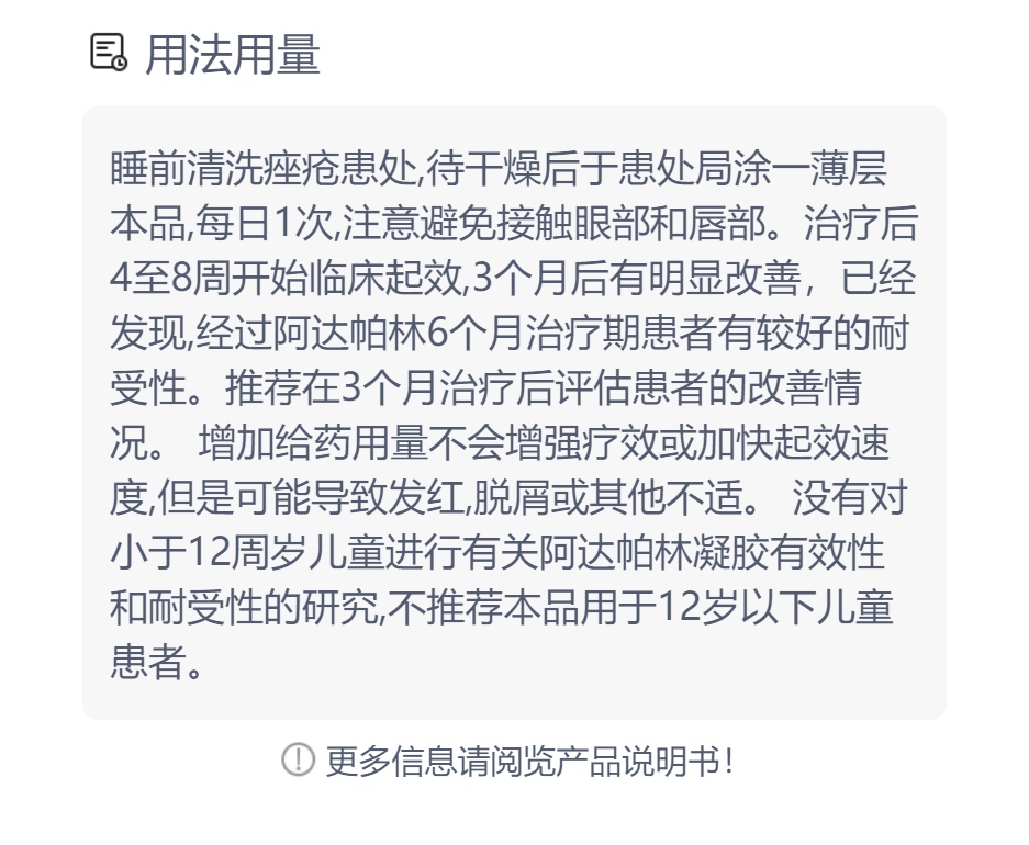 1、如果产生过敏或严重的刺激反应,应停止用药。 2、确定局部刺激反应程度后,患者可在医生指导下减少用药。 3、在使用本品期间,如果暴露在日光下,包括发出紫外线的太阳灯,应将剂量降低到最小用量。 4、对于经常暴露在强日光下和自身对阳光过敏的患者,在户外锻炼时应特别注意。 5、当在阳光下是不可避免时,建议在治疗区域上使用防晒产品和保护服;当气候极端异常时,如有大风或寒冷,对接受本品治疗的患者也可能产生刺激性。 6、避免接触眼、唇、口腔、鼻粘膜、内眦和其它粘膜组织,本品不应用在刀伤、擦伤湿疹或晒伤的皮肤上,亦不得应用于十分严重的痤疮患者,或患有湿疹样的皮肤创面。当用其它维生素A酸类药物或使用“蜡质”脱毛方法时,应避免使用本品进行治疗。 7、孕妇及哺乳期妇女用药: (1)目前尚无有关本品对孕妇的疗效报告。建议在妊娠时不要使用本品。 (2)目前尚不知本品是否随乳汁分泌。因许多药物随乳汁分泌,建议哺乳期妇女若必须使用本品时多加小心,请勿涂抹于胸部。 8、儿童用药:在12岁以下儿科患者中,其安全性和有效性尚未确。 9、老年用药:临床试验中,受试者年龄均在12-30岁之间,因此尚不明确65岁以上老年人与年轻人之间是否不同。 10、药物过量:本品仅供皮肤外用。过量应用并不会获得更快或更好的疗效,且可出现显著的发红、脱屑或皮肤不适。