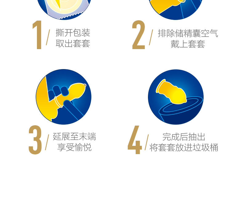避孕套为一次性使用。如果再次使用,可能会增加性传播疾病的感染或者受孕的几率。 如果发现单个包装明显损坏,该避孕套应弃用,并更换包装完好的避孕套。 避孕套应储存在阴凉干燥,不受阳光直射的地方。 本产品主要成分为天然胶乳,虽经特殊处理,仍可能会引起致敏反应。包括过数性休克。对胶乳制品敏感的使用者,请于使用前咨询医生。 避孕套部分产品的润滑剂中含有香料,可能对某些人引起过敏反应,请于使用前咨询医生。 如果希望使用另外的润滑剂,则应使用经推荐、与避孕套一同并用、正确类型的润滑剂,如水基润滑剂;应避免使用油甚的润滑剂,比如凡士林、婴儿油、浴液、按摩油、黄油、人造黄油等,原因是这些会破坏避孕套的完整性。 如果使用者感觉到避孕套滑脱或者太紧,应停止并加以检查,因为这样可能导致避孕套破裂。 避孕套为一次性使用。如果再次使用,可能会增加性传播疾病的感染或者受孕的几率。 如果发现单个包装明显损坏,该避孕套应弃用,并更换包装完好的避孕套。 游孕套应储存在阴凉干燥,不受阳光直射的地方。本产品主要成分为天然胶乳,虽经特殊处理,仍可能会引起致敏反应。包括过数性休克。对胶乳制品敏感的使用者,请于使用前咨询医生。 避孕套部分产品的润滑剂中含有香料,可能对某些人引起过敏反应,请于使用前咨询医生。 如果希望使用另外的润滑剂,则应使用经推荐、与避孕套一同并用、正确类型的润滑剂,如水基润滑剂;应避免使用油甚的润滑剂,比如凡士林、婴儿油、浴液、按摩油、黄油、人造黄油等,原因是这些会破坏避孕套的完整性。 如果使用者感觉到避孕套滑脱或者太紧,应停止并加以检查,因为这样可能导致避孕套破製。 避孕套在使用过程中发生泄漏或者破损,72小时内要尽早寻求医疗补救。 某些局部性用药可能影响到避孕套的效用,请在使用前咨询医生或药剂师有关与避孕套接触的可适用的药物。 避孕套使用于非阴道性交时,会增加破提或滑落的几率。 每只避孕套铝落包装上均印有使用期限,请在有效期内使用。 目前,没有一种方式可达到100%避孕及预防性传播疾病(如:性病、艾滋病等)。