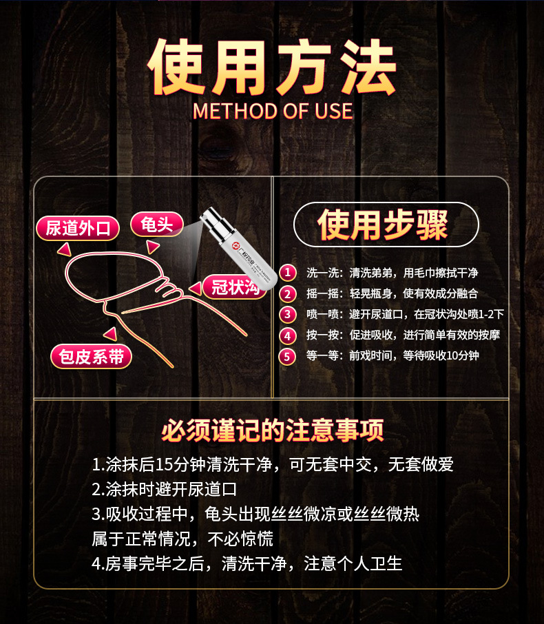 1.本品为外用产品,禁止口服; 2.皮肤病患者或过敏者请勿使用; 3.特定部位如有伤口或肿胀,请勿使用; 4.误入眼睛时,请立即用水清洗;如有不适,请及时就医; 5.使用过程中出现异常(瘙痒,湿疹等)请停止使用并用清水冲洗; 6.请勿放置儿童易取处,以防误吞食; 7.18岁以下人群禁止使用;8.请储存于常温避光干燥处; 9.本产品无避孕及预防性病作用。