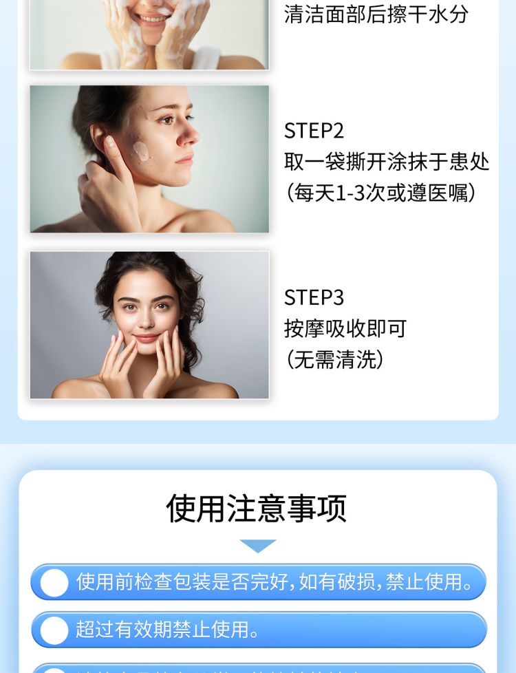 使用前检查包装是否完好,如有破损,禁止使用。创面感染的患者不宜使用。使用中如有不适、红肿、疼痛或瘙痒,请立即停止使用并及时就医。