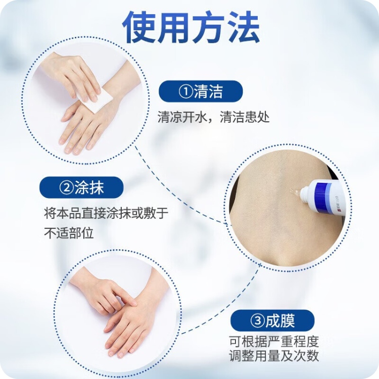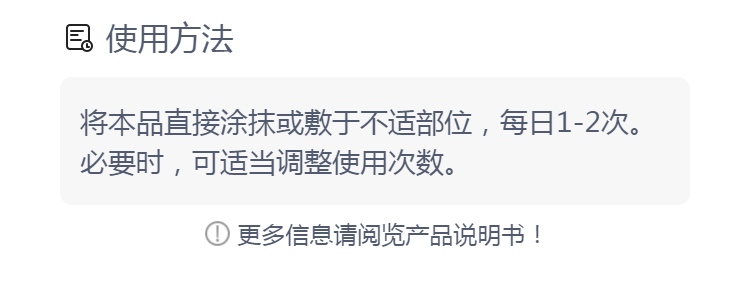 1.本品为外用品,严禁口服; 2.过敏体质者慎用,皮肤如出现瘙痒,皮疹等过敏现象应立即停止使用; 3.婴幼儿酌情使用,儿童必须在成人监护下使用; 4.勿入口,眼,不慎入眼,应尽快用净水冲洗。